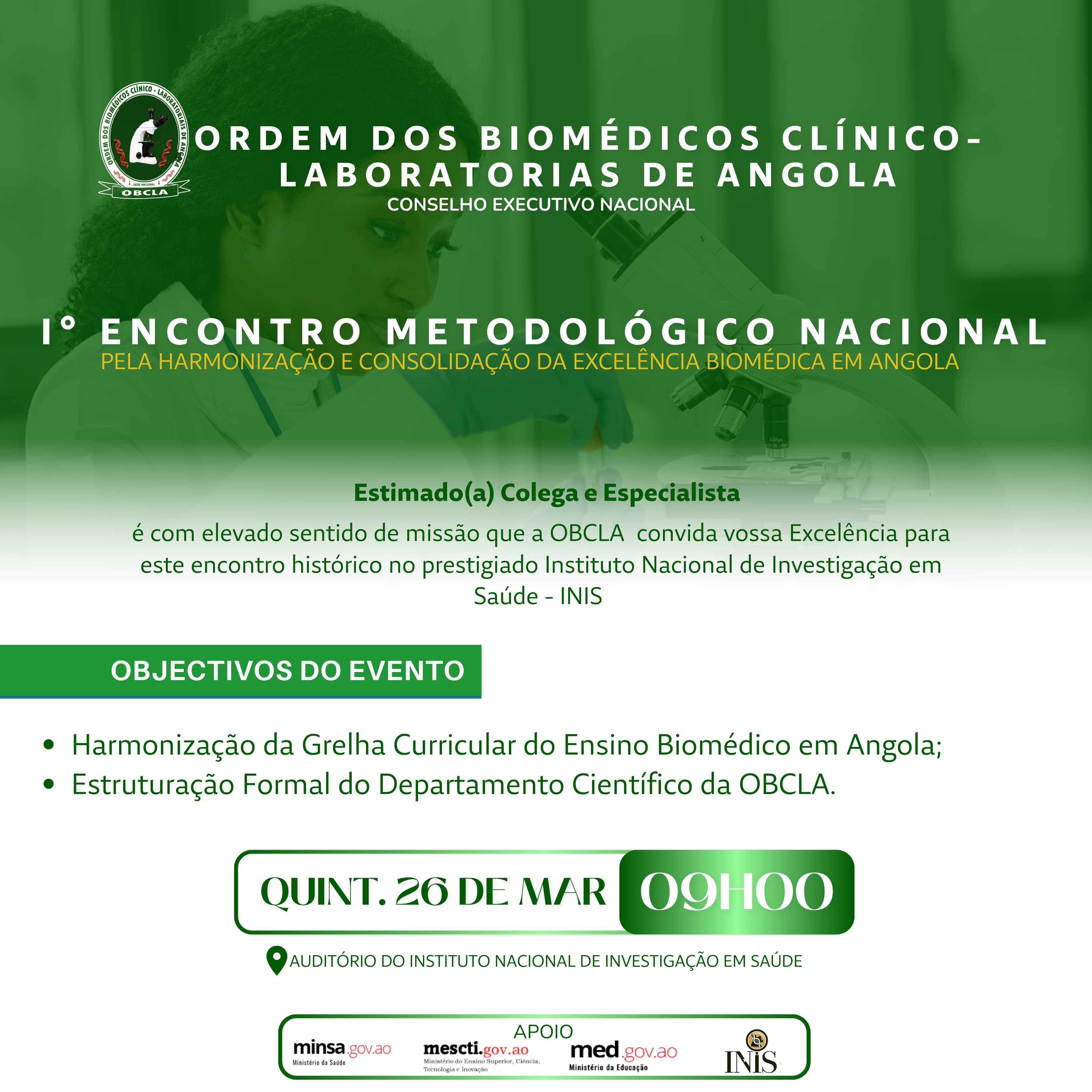 1ª ASSEMBLEIA DA ORDEM DOS BIOMÉDICOS CLÍNICOS LABORATORIAIS DE ANGOLA. SOB O LEMA: Biomédicos Laboratoriais a promover a sustentabilidade no Diagnóstico Clínico.